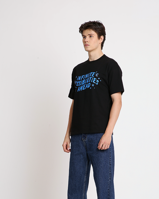 Embrace the power of potential with this oversized t-shirt from Bee & Beaver (B&B). Featuring the inspiring phrase “Infinite Possibilities Ahead”, the design motivates you to pursue your dreams and stay fearless in every endeavor. The sleek black canvas makes the bold lettering pop, creating a statement piece that is both stylish and meaningful.